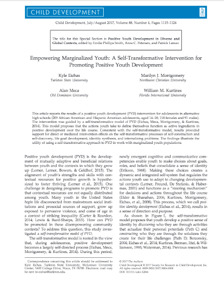 This article reports the results of a positive youth development (PYD) intervention for adolescents in alternative high schools (209 African American and Hispanic American adolescents, aged 14–18; 118 females and 91 males).The intervention was guided by a self-transformative model of PYD (Eichas, Meca, Montgomery, & Kurtines,2014). This model proposes that the actions youth take to define themselves function as active ingredients in positive development over the life course. Consistent with the self-transformative model, results provided support for direct or mediated intervention effects on the self-transformative processes of self-construction and self-discovery, life goal development, identity synthesis, and internalizing problems. The findings illustrate the utility of using a self-transformative approach to PYD in work with marginalized youth populations.